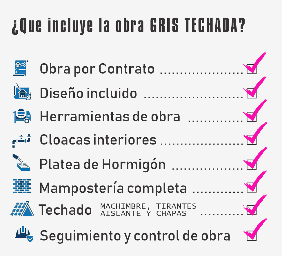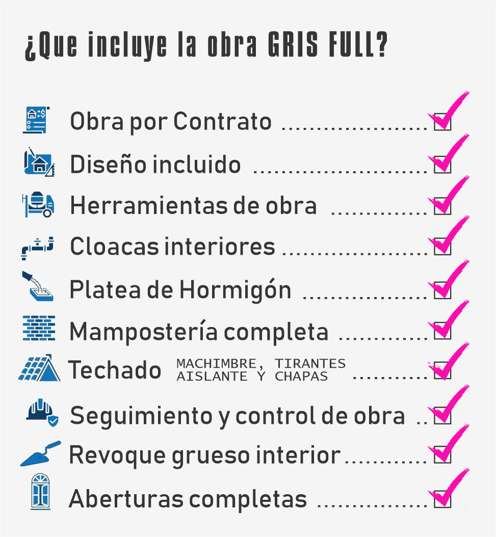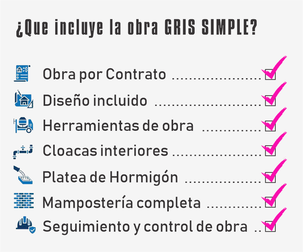 Diseño sin cargo. Armado de hierros de platea, armado de estructura de platea, llenado de platea con hormigón elaborado H17 con sus anclajes. Armado de sistema interno integral de cloacas de la casa. Levantamiento de mampostería hasta altura de techado, armado, encofrado y llenado de columnas, vigas y encadenados. Revoque grueso interior. Precio publicado en base a construcción en una sola planta, con un baño.